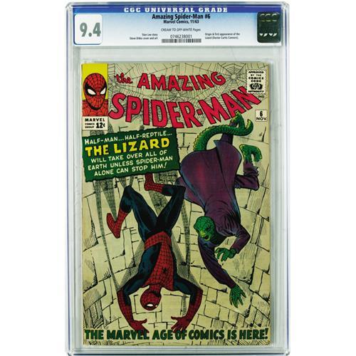 <B>The Amazing Spider-Man #6 (Marvel, 1963) CGC NM 9.4 Cream to off-white pages.</B></I> The Lizard, one of Spider-Man's most memorable foes, made his first of many appearances in this issue. Every Lizard story always had the same wrenching undercurrent: Spidey always had to pull his punches because the villain was really his pal Curt Connors (spelled Conners about half the time)... but the Lizard had no such compunctions about walloping the Webhead! Writer Stan Lee and artist Steve Ditko delivered the action. If you're off to see the Lizard, bring a healthy bidding budget, as this is among the finest copies yet certified of this issue from comics' most-collected title. Overstreet 2006 NM- 9.2 value = $3,200. CGC census 3/06: 9 in 9.4, 6 higher.