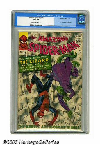 <B>The Amazing Spider-Man #6 (Marvel, 1963) CGC NM- 9.2 Cream to off-white pages.</B></I> Peter Parker's off to see the Lizard on a road trip to Florida, and as if that weren't trouble enough, J. Jonah Jameson's tagging along! This is the very first appearance of the Lizard, whose true identity is Dr. Curt Connors. The cover and interior art are by Steve Ditko. Overstreet 2005 NM- 9.2 value = $3,000. CGC census 5/05: 13 in 9.2, 15 higher.