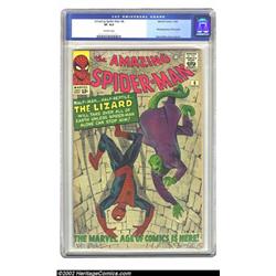 The Amazing Spider-Man #6 (Marvel, 1963) CGC VF 8.0 Off-white pages. This issue features the first appearance of the Lizard, one of Spider-Man's most interesting nemeses. Many regard Stan Lee and Steve Ditko's stint on The Amazing Spider-Man to be the finest comic stories of the Silver Age. This is a chance to own a part of that history by picking up this affordable high-grade copy. Overstreet 2002 VF 8.0 value = $1,062. Important notice: We expect to be auctioning lots at the rate of 200-250 per hour. Sometimes eBay Premier live bid software cannot keep up with that pace, so we strongly recommend that you place a realistic proxy bid now as insurance to avoid disappointment. Also please note that all Heritage/CAA lots purchased through eBay Premier carry a 20% Buyer's Premium. Please make sure you read the Terms and Conditions.