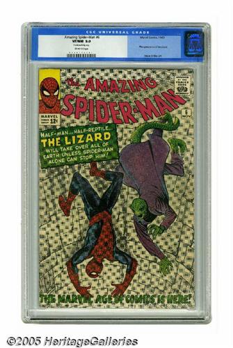 <B>The Amazing Spider-Man #6 (Marvel, 1963) CGC VF/NM 9.0 Off-white pages.</B></I> Who was Spider-Man's scaliest foe on a scale of 1 to 10? That would be the Lizard, who made his first appearance in this issue. The book's cover and art are by Steve Ditko. CGC notes, "Pre-Marvel chipping." Overstreet 2005 VF/NM 9.0 value = $2,162; NM- 9.2 value = $3,000. CGC census 6/05: 22 in 9.0, 28 higher.