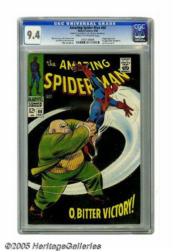 <B>The Amazing Spider-Man #60 (Marvel, 1968) CGC NM 9.4 Cream to off-white pages.</B></I> Why is Captain Stacy committing a crime? Spider-Man aims to find out in this story, which has a Kingpin appearance. The cover and interior art are by John Romita Sr. A great-looking copy of a black-cover issue! Overstreet 2005 NM- 9.2 value = $160. CGC census 6/05: 10 in 9.4, 11 higher. <I>From the collection of Joe and Nadia Mannarino.</B></I>