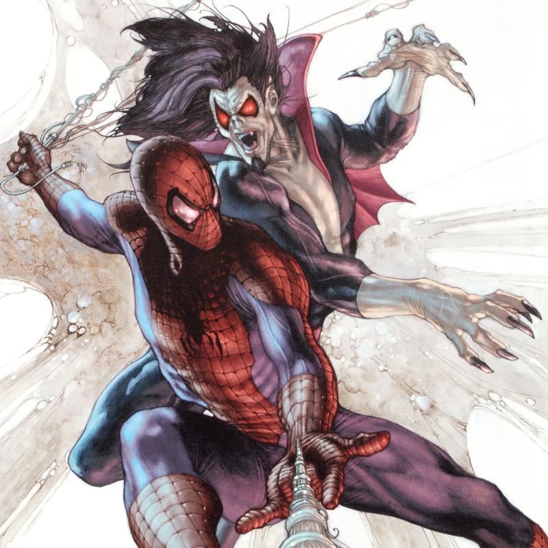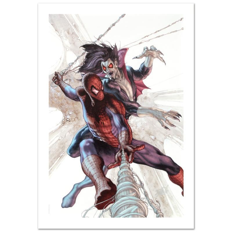 A piece of comic book history, this limited edition print, drawn by Simone Bianchi, depicts the classic characters Spider-Man and Morbius. Known for his use of ink wash in his work, Simone Bianchi is an Italian comic book artist famous for his X-Men Unlimited artwork. "The Amazing Spider-Man #622" is a limited edition giclee on canvas by Simone Bianchi presented by Marvel Comics, numbered and hand signed by the great Stan Lee! Includes Certificate of Authenticity! Measures approx. 18" x 27" (image).