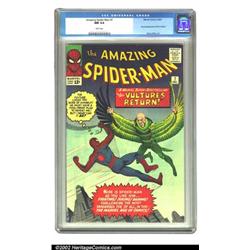 The Amazing Spider-Man #7 (Marvel, 1963) CGC NM 9.4 White pages. The Vulture returns in this first monthly issue of Amazing Spider-Man. With Spidey's new monthly schedule, the Marvel Age of comics was really kicking into high gear. This gorgeous copy is a joy to behold with its brilliant colors and white pages. Seeing this fantastic comic will give any fan the feeling of going back in time to when this book was on the newsstand, fresh from the printers. No other copies have been graded higher by CGC. Overstreet 2002 NM 9.4 value = $1,300. Important notice: We expect to be auctioning lots at the rate of 200-250 per hour. Sometimes eBay Premier live bid software cannot keep up with that pace, so we strongly recommend that you place a realistic proxy bid now as insurance to avoid disappointment. Also please note that all Heritage/CAA lots purchased through eBay Premier carry a 20% Buyer's Premium. Please make sure you read the Terms and Conditions.