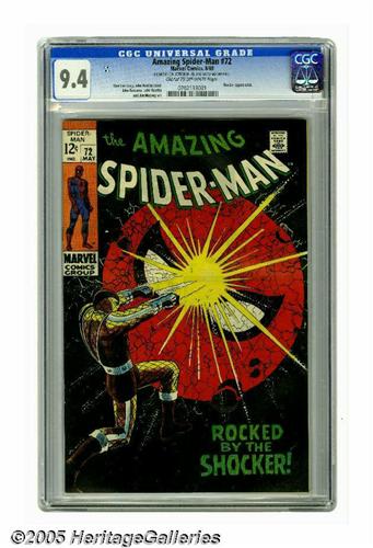 <B>The Amazing Spider-Man #72 (Marvel, 1969) CGC NM 9.4 Cream to off-white pages.</B></I> This series produced a number of issues that included the bane of high-grade collectors everywhere, the black cover... #72 being a case in point. Well, here's a high-grade copy of this book for ya, and all you have to do is bid! Spider-Man takes on the Shocker in this issue, which has art by John Buscema (breakdowns), John Romita Sr. (finished pencils) and Jim Mooney (inks). Overstreet 2005 NM- 9.2 value = $120. CGC census 6/05: 12 in 9.4, 8 higher. <I>From the collection of Joe and Nadia Mannarino.</B></I>