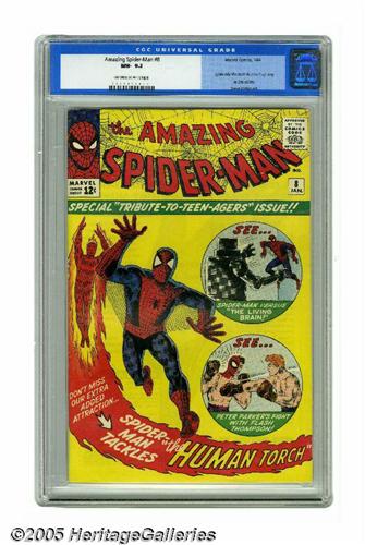 <B>The Amazing Spider-Man #8 (Marvel, 1964) CGC NM- 9.2 Off-white to white pages.</B></I> Jack Kirby got to take a turn at penciling the Webhead this issue in a backup feature inked by Steve Ditko. And the story shows a whole new side of Spidey, as he brazenly makes a play for the Human Torch's girl Dorrie, making Mr. Storm hot under the collar (and everywhere else). The main story, with Ditko pencils, features a robot that tries to deduce Spidey's secret identity. Overstreet 2005 NM- 9.2 value = $1,900. CGC census 6/05: 19 in 9.2, 27 higher.
