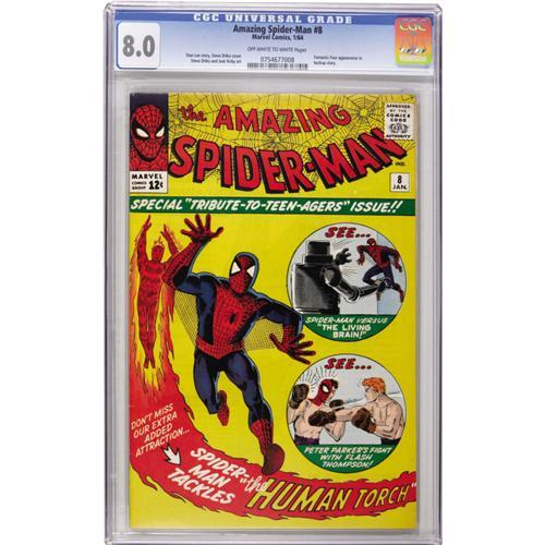 <B>The Amazing Spider-Man #8 (Marvel, 1964) CGC VF 8.0 Off-white to white pages.</B></I> The Fantastic Four appear in a back-up story with art by the incredible Jack Kirby and Steve Ditko. Stan Lee also provided his writing talents on the book and Ditko furnished the cover. Overstreet 2006 VF 8.0 value = $808. CGC census 10/06: 37 in 8.0, 93 higher.<BR><BR><b>Shipping:</b> Slabbed Comic (<a target="_blank" href="http://www.heritageauctions.com/common/shipping.php">view shipping information</a>)