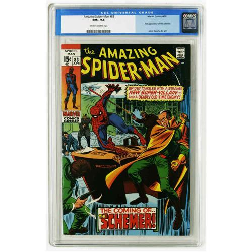 <B>The Amazing Spider-Man #83 (Marvel, 1970) CGC NM+ 9.6 Off-white to white pages.</B></I> It's the first appearance of the Schemer, who wants to muscle in on the Kingpin's territory! Hmmm, what's the connection between him and the Kingpin? . The issue's cover and interior art are by John Romita Sr. Overstreet 2005 NM- 9.2 value = $100. CGC census 12/05: 11 in 9.6, 2 higher.