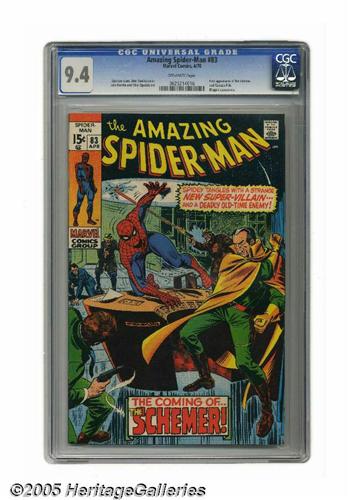 <B>The Amazing Spider-Man #83 (Marvel, 1970) CGC NM 9.4 Off-white pages.</B></I> First appearance of the Schemer. Art by John Romita and Mike Esposito (as Mickey Demeo). Overstreet 2005 NM- 9.2 value = $100. CGC census 1/05: 22 in 9.4, 13 higher. <I>From the collection of Richard and Wendy Pini.</B></I>
