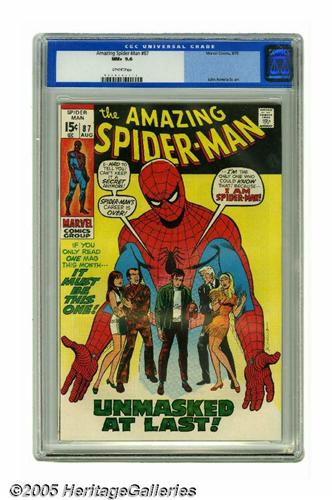 <B>The Amazing Spider-Man #87 (Marvel, 1970) CGC NM+ 9.6 Off-white pages.</B></I> This is the nicest copy we've ever offered of this particular issue, and no copy has been graded higher by CGC to date. In the issue, a sick Peter Parker reveals to his friends that he is Spider-Man! How's he going to get out of this one once he comes to his senses? The issue has a John Romita Sr. cover, with interior art by Romita and Jim Mooney. Overstreet 2005 NM- 9.2 value = $100. CGC census 6/05: 5 in 9.6, none higher.