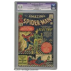 <B>The Amazing Spider-Man #9 (Marvel, 1964) CGC Apparent VF 8.0 Slight (A) Off-white pages.</B></I> This issue features the shocking introduction of Electro, a character who had his roots in prototype versions that had appeared in <B>Tales of Suspense</B></I> #13 and <B>Tales to Astonish</B></I> #15. We probably don't need to tell you, but this is another issue drawn by the legendary Steve Ditko. CGC notes: "Restoration includes: very small amount of color touch on cover. (TOP EDGE OF COVER TRIMMED)." Overstreet 2004 GD 2.0 value = $106; VG 4.0 value = $212; FN 6.0 value = $318; VF 8.0 value = $901.