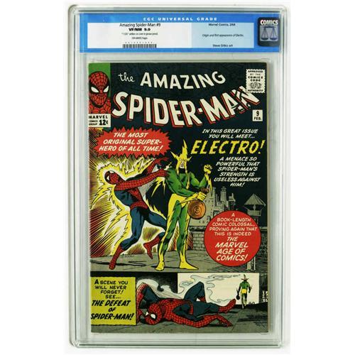 <B>The Amazing Spider-Man #9 (Marvel, 1964) CGC VF/NM 9.0 Off-white pages.</B></I> Electro's origin and first appearance are in this issue, and not only does the Webslinger have to take on the villain, he has to worry about -- you'll never guess -- Aunt May's ill health. The issue's cover and interior art are by Steve Ditko. CGC notes, "'11/26' written on cover in grease pencil." Overstreet 2005 VF/NM 9.0 value = $1,636; NM- 9.2 value = $2,025. CGC census 12/05: 22 in 9.0, 37 higher.