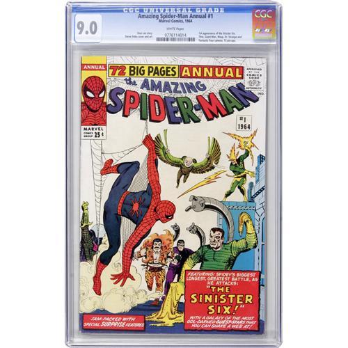 <B>The Amazing Spider-Man Annual #1 (Marvel, 1964) CGC VF/NM 9.0 White pages.</B></I> <I>Everybody</B></I> saved this one, because it was packed with great content, but finding a copy in high grade is another matter entirely! Most of the Spidey villains who had appeared to date joined up here to form the Sinister Six. The X-Men made an early appearance, and Thor, Giant-Man, the Wasp, Dr. Strange, and the Fantastic Four all cameoed, with Steve Ditko drawing all the action. Overstreet 2006 VF/NM 9.0 value = $1,178; NM- 9.2 value = $1,650. CGC census 3/07: 18 in 9.0, 18 higher.<BR><BR><b>Shipping:</b> Comics - Slabbed (certified) (<a target="_blank" href="http://www.heritageauctions.com/common/shipping.php">view shipping information</a>)