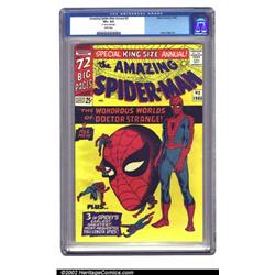 The Amazing Spider-Man Annual #2 (Marvel, 1965) CGC VF+ 8.5 White pages. This classic Steve Ditko cover leads off the second of Spidey's Annuals, which reprints material from ASM #1, 2, and 5, as well as a brand-new Doctor Strange story. This gorgeous high-grade copy (rare on these squarebound annuals) features eye-popping colors and a nearly immaculate spine. A fantastic copy of this Spider-Man classic. CGC notes: "1/2 inch tear on 2nd page." Overstreet 2002 VF 8.0 value = $210. Important notice: We expect to be auctioning lots at the rate of 200-250 per hour. Sometimes eBay Premier live bid software cannot keep up with that pace, so we strongly recommend that you place a realistic proxy bid now as insurance to avoid disappointment. Also please note that all Heritage/CAA lots purchased through eBay Premier carry a 20% Buyer's Premium. Please make sure you read the Terms and Conditions.