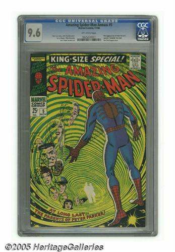 <B>The Amazing Spider-Man Annual #5 (Marvel, 1968) CGC NM+ 9.6 Off-white pages.</B></I> In this issue, readers finally caught their long-awaited first glimpse of Peter Parker's deceased parents. And it turns out Mom and Pop weren't sedentary types like Uncle Ben and Aunt May -- in fact, investigating the outcome takes him to Algeria, and worse, the Red Skull is mixed up in it all! All of this and a Fantastic Four appearance, too. The cover is by John Romita Sr; interior art is the work of Larry Lieber. Overstreet 2005 NM- 9.2 value = $175. CGC census 1/05: 6 in 9.6, none higher. <I>From the collection of Richard and Wendy Pini.</B></I>