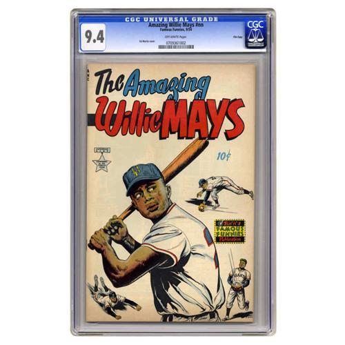 <B>The Amazing Willie Mays #nn File Copy (Famous Funnies, 1954) CGC NM 9.4 Off-white pages.</B></I> This is the nicest copy we've ever offered of this issue, and in fact it's the nicest grade CGC has awarded as of this writing. The cover illustration of the Say Hey Kid is by Ed Moritz. Overstreet 2005 NM- 9.2 value = $975. CGC census 12/05: 2 in 9.4, none higher.