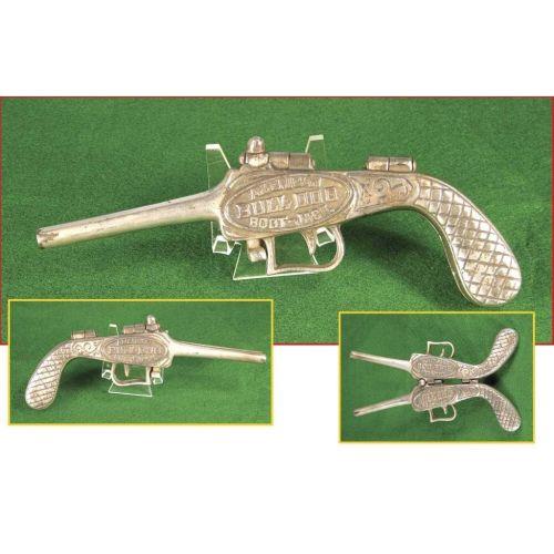 The American Bull Dog Boot Jack in the shape of a pistol. Nickel plated cast iron. Very good condition. 9 inches long.