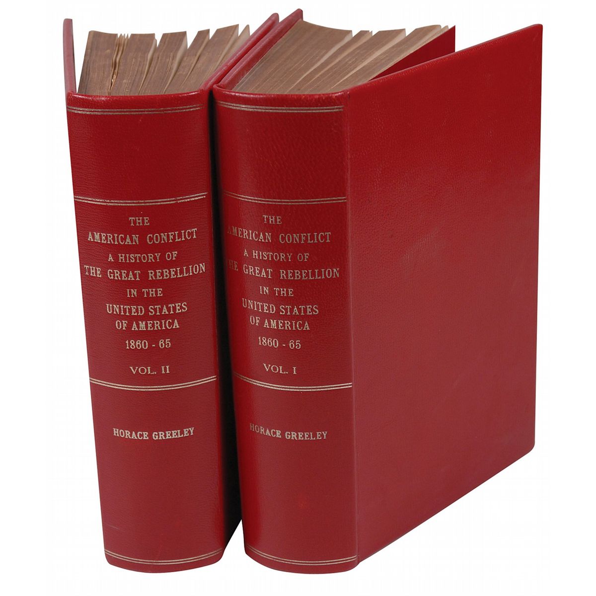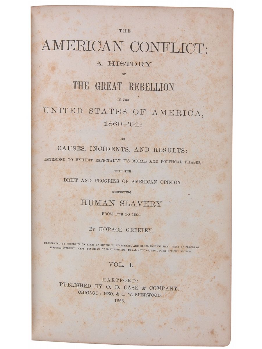 Books: The American Conflict: A History of the Great Rebellion in the United States of America, two volumes, by Horace Greeley. Hartford: O. D. Case & Company, 1866. Hardcover, 7 x 9.75, 648 and 782 pages. Book condition: VG/None. Both volumes nicely rebound in red leather with gilt titles on spine and red silk moiré endpapers. Both have minor wear to exteriors; soiling to textblock edges; light foxing throughout (heavier at first/last several pages and tissue pages over illustrations). “From the estate of Horace Greeley IV” written in pencil on the ffep of volume 1.