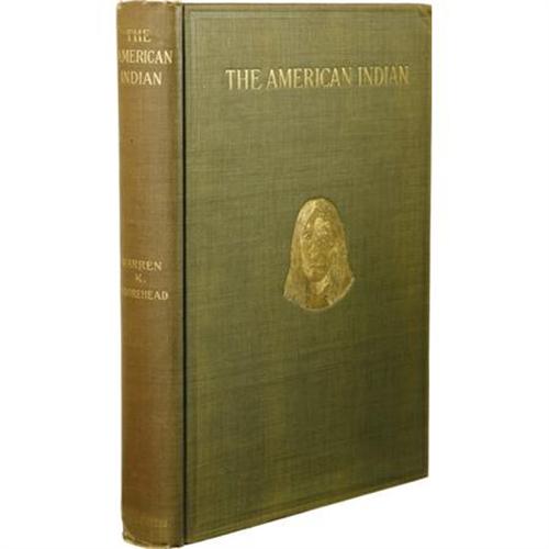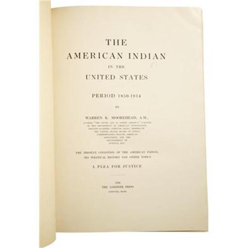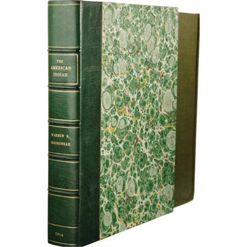 <B>Warren K. Moorehead: A Spectacular Copy of <I>The American Indian in the United States.</B></I></B></I> Period 1850-1914. The Present Condition of the American Indian; His Political History and Other Topics. A Plea for Justice. (Andover, Mass.: The Andover Press, 1914). First edition. Quarto (9.5” x 7”). 440 pages. Profusely illustrated, including wonderful sepia-tone photogravures of Indians by Rodman Wanamaker. Publisher's green cloth, illustrated and lettered in gilt. Binding lightly rubbed, front free endpaper with previous owner's name, sheets a bit creased at top fore-edge corner, else an excellent copy in fine condition. Housed in a quarter morocco over marbled boards book-backed slipcase, the spine in compartments with five raised bands, and lettered and tooled in gilt.<BR><BR><b>Shipping:</b> Books & Catalogs (<a target="_blank" href="http://www.heritageauctions.com/common/shipping.php">view shipping information</a>)