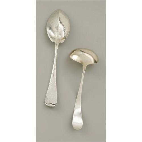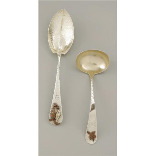 <B>The American Mixed Metal Serving Spoon and Ladel</B></I><BR>Mark of Gorham, Providence, RI, Late Nineteenth Century, and Dominick & Haff, New York, NY, 1868-1928<BR><BR>The <I>Gorham</B></I>hammered serving spoon with applied cherry plant, monogram to handle <I>AFF,</B></I> maker's hallmark to reverse; <I>together with</B></I> a <I>Dominick & Haff</B></I> mixed metal ladel, gilt bowl and applied avian motif to handle<BR>The serving spoon: 9in. long; The ladel: 7in. long<BR>2 Items <BR><BR><B>Condition Report:</B> Normal signs of wear with age