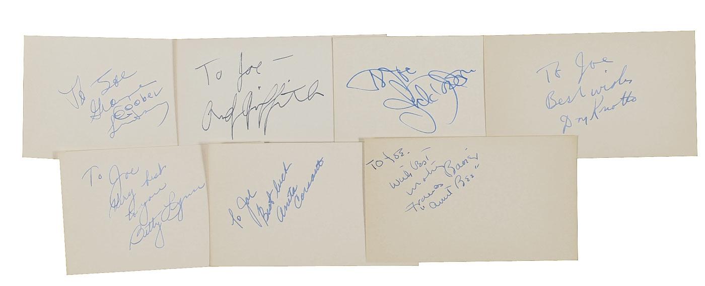 In-person ink signatures and inscriptions of seven cast members of The Andy Griffith Show on individual off-white 5 x 3 cards. Signers are: Andy Griffith, Don Knotts, Frances Bavier, George Lindsey, Betty Lynn, Aneta Corsaut, and Jack Dodson. In fine condition.