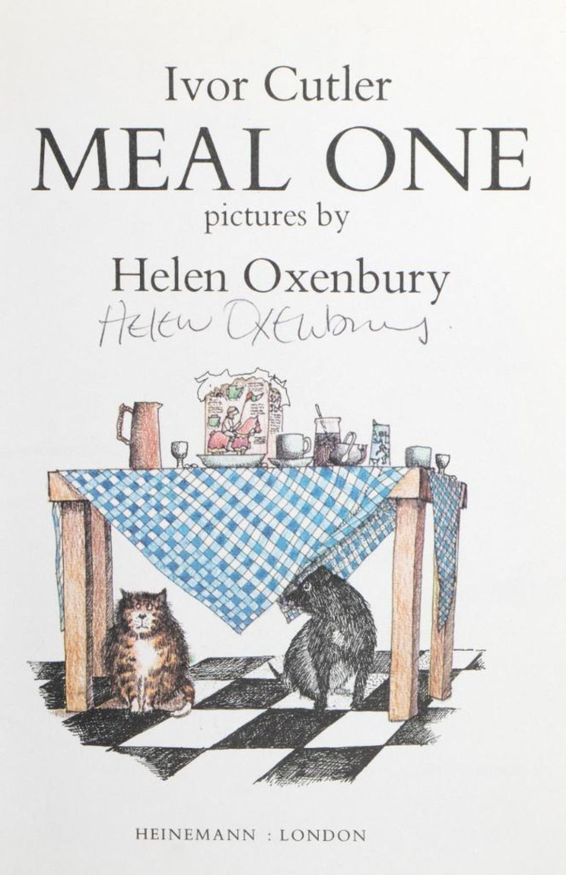 The Animal House by Ivor Cutler, illustrated by Helen Oxenbury. William Heinemann 1976, no statement of edition. Illustrated hardcover with matching jacket. Signed by Oxenbury on the title page. Meal One by Ivor Cutler, illustrated by Helen Oxenbury. William Heinemann 1971 first edition. Illustrated hardcover with matching jacket. Signed by Oxenbury on the title page. Both Fine in very good to fine jackets.