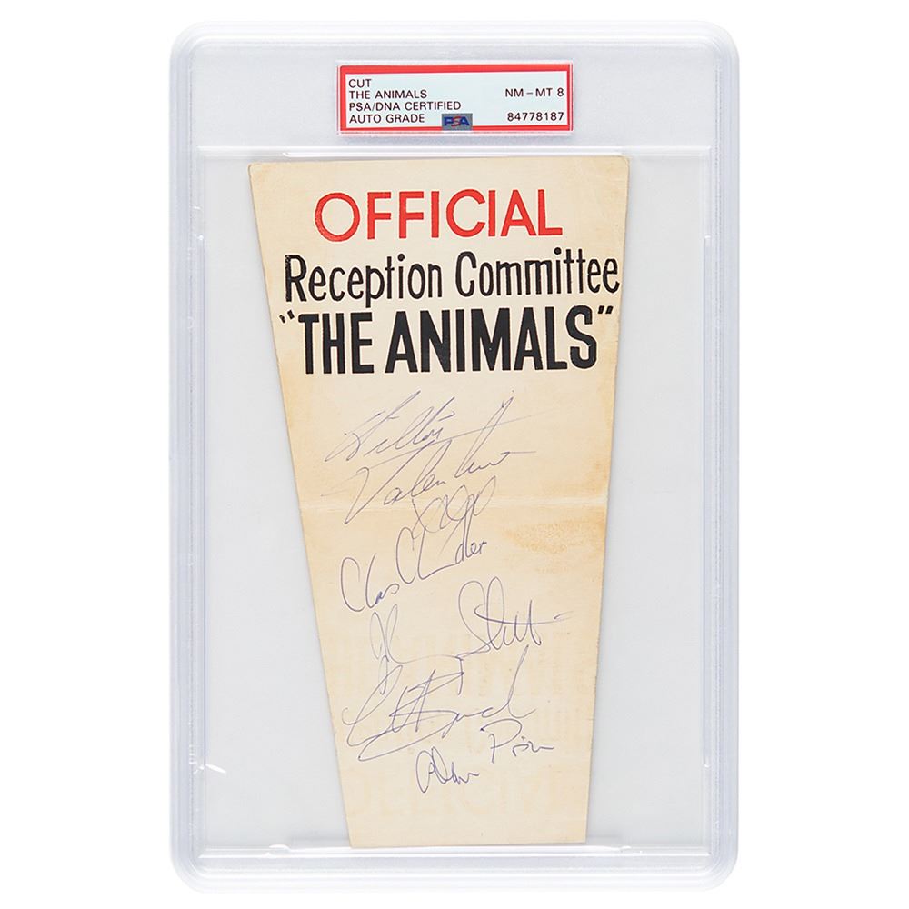 Vintage ballpoint signatures of The Animals& mdash;Eric Burdon, Alan Price, Chas Chandler, Hilton Valentine, and John Steel& mdash;on an & lsquo;Official Reception Committee & lsquo;The Animals& rsquo;& rsquo; card, 4.5 x 8, which was attested to as being signed at the JFK airport when the band made the debut visit to America. In very good to fine condition, with creasing and light staining. Encapsulated and graded by PSA/DNA as "NM-MT 8."