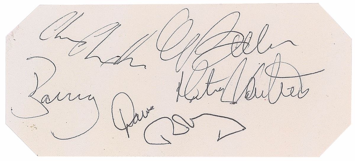 Vintage circa 1966 ballpoint signatures of Eric Burdon, Chas Chandler, Dave Rowberry, Barry Jenkins, and Hilton Valentine on a white 5.5 x 2.5 slip. In fine condition. An unusual assortment of signatures, as Rowberry and Chandler were replacements.