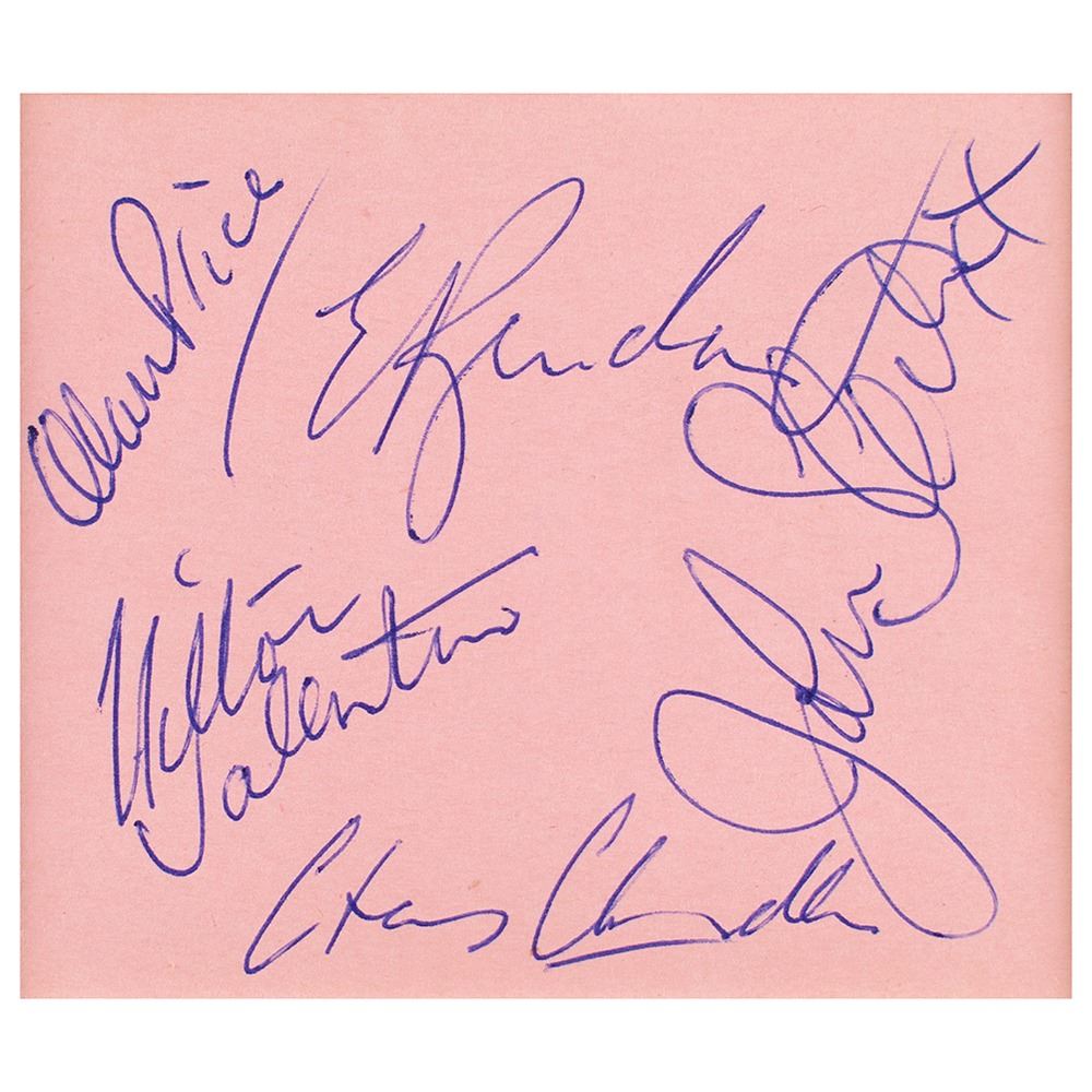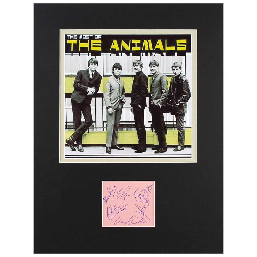 Vintage ballpoint signatures of The Animals‰ÛÓEric Burdon, Chas Chandler, John Steel, Hilton Valentine, and Alan Price‰ÛÓon a pink 3.25 x 2.75 sheet. Double-matted with a photo to an overall size of 12.25 x 16.25. In fine condition.