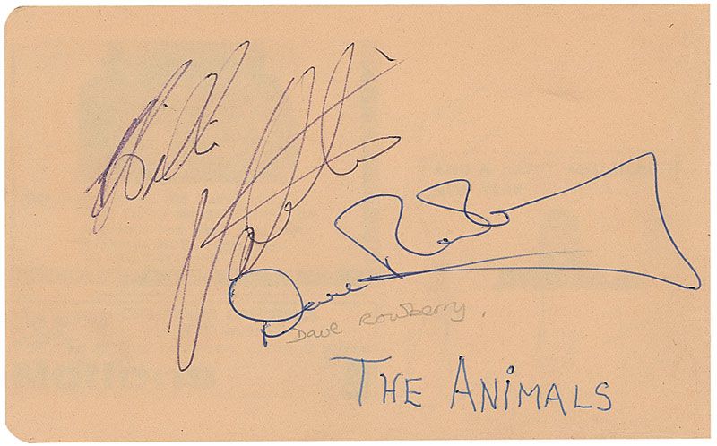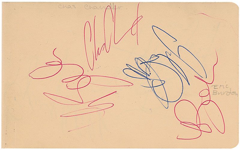 Vintage ballpoint signature Eric Burdon, Chas Chandler, Dave Rowberry, Hilton Valentine, John Steel and one other on two off-white 6 x 3.75 album pages with a few collector’s pencil notations. In fine condition, with a couple wrinkles. Accompanied by a certificate of authenticity from Tracks.