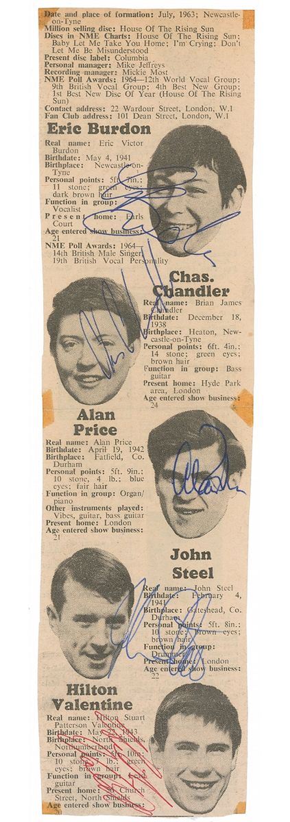 Vintage newspaper biography featuring images of the band members, 3 x 10.75, signed in blue and red ballpoint by Eric Burdon, Chas Chandler, Alan Price, John Steel, and Hilton Valentine. Toned tape remnants to corners and slightly irregularly trimmed edges, otherwise fine condition.