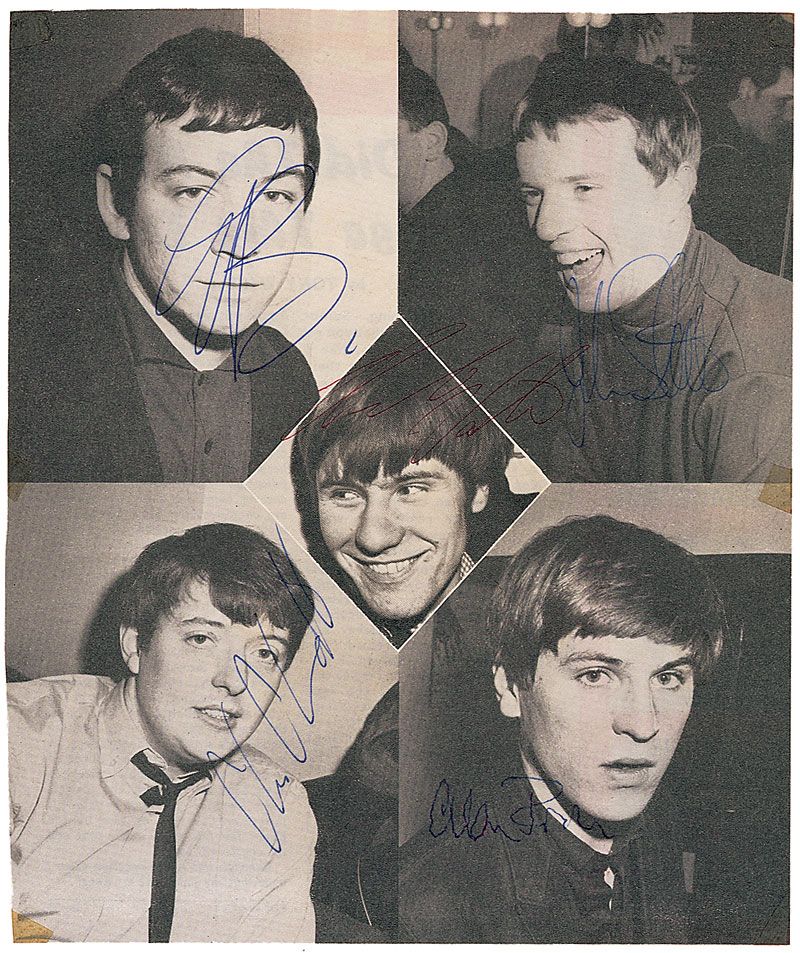 Vintage 7 x 8.25 composite magazine photo of each band member, signed in blue and red ballpoint by Eric Burdon, Chas Chandler, Alan Price, John Steel, and Hilton Valentine. In fine condition, with toned tape remnants to borders.
