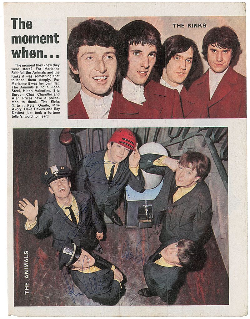 Magazine page featuring a color image of the band, 8.25 x 10.75, signed on the image in ink by Eric Burdon, Chas Chandler, Alan Price, John Steel, and Hilton Valentine. In fine condition, with moderate contrast to signatures. Accompanied by a certificate of authenticity from Roger Epperson/REAL.