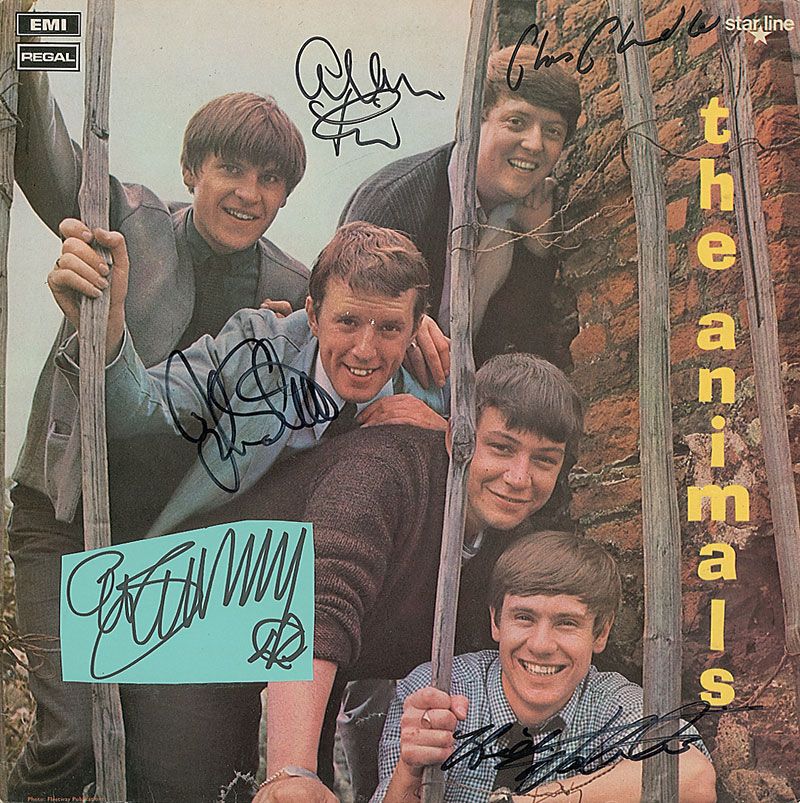 Self-titled album signed on the front cover in black felt tip by Alan Price, Chas Chandler, Hilton Valentine, and John Steel, with a clipped felt tip signature of Eric Burdon on a light blue card affixed to the front cover. In fine condition. The record is included.