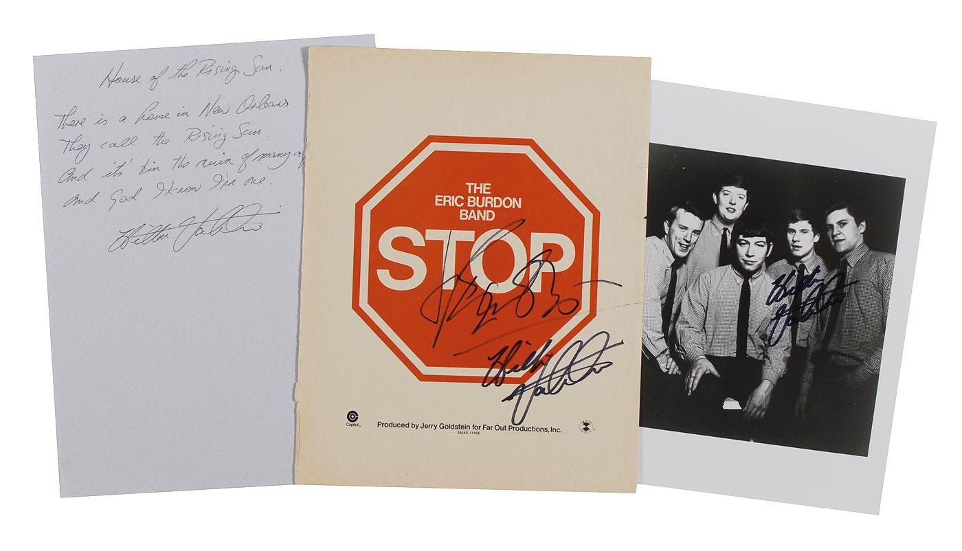 Three items: souvenir handwritten lyrics to the beginning of ‘House of the Rising Sun,’ one page, 8.5 x 11, written out and signed by Hilton Valentine; a glossy 8 x 10 group photo, signed in black felt tip by Valentine; and a color 8.5 x 11 magazine trade ad, signed in black felt tip by Eric Burdon and Hilton Valentine. In fine condition, with toning and handling wear to ad.