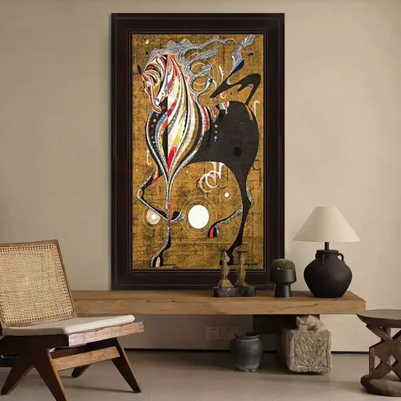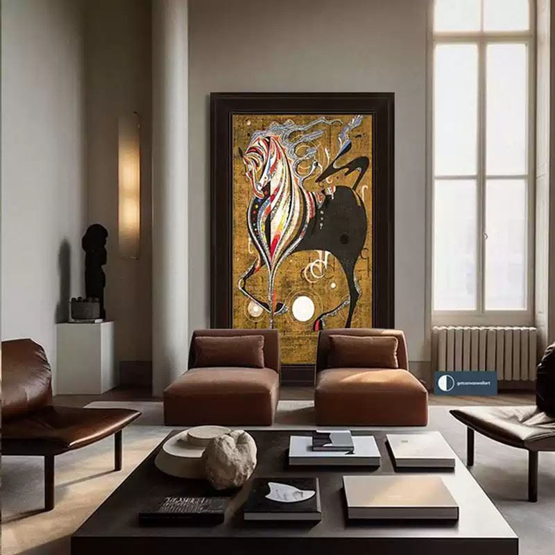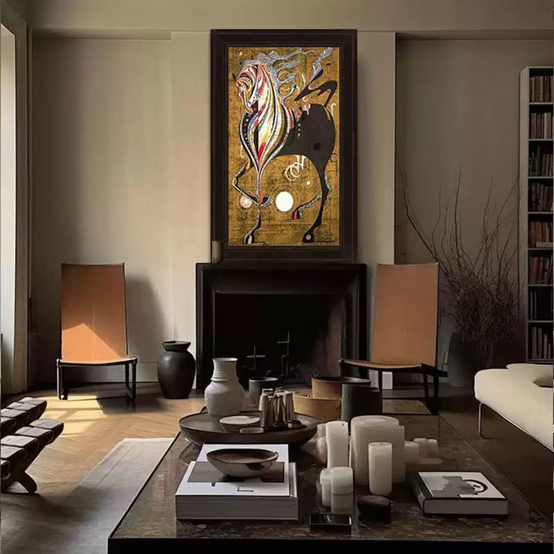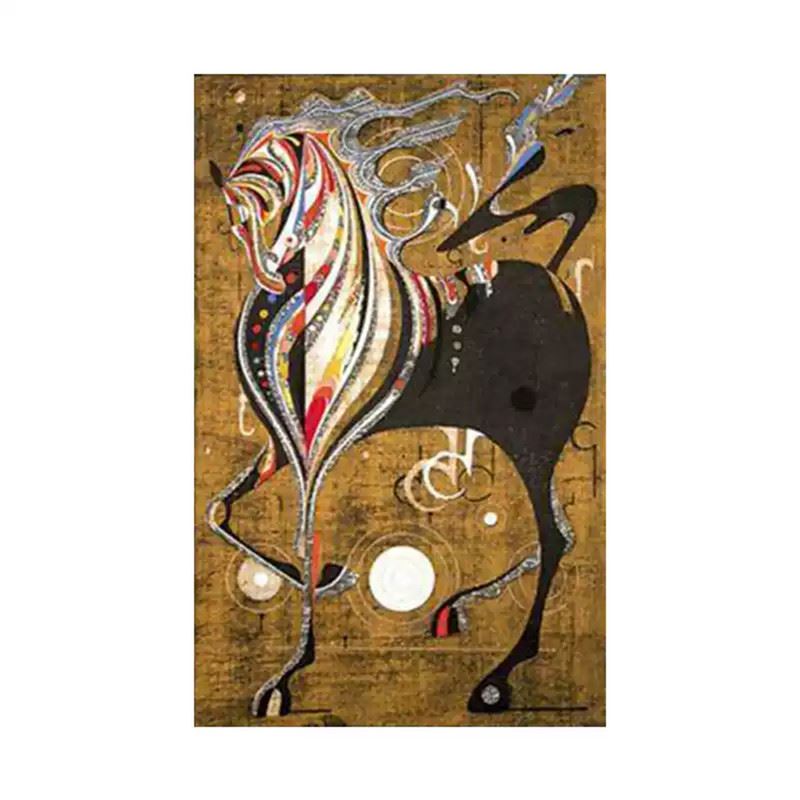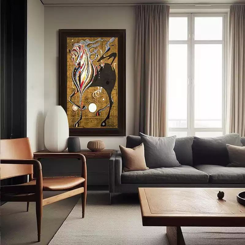 This artwork captures the dynamic beauty of a horse through vibrant colors and flowing lines. The rich color gradients and unique composition symbolize the fusion of strength and freedom, infusing the image with vitality and a sense of speed. Dimensions: 24 x 35 inches.