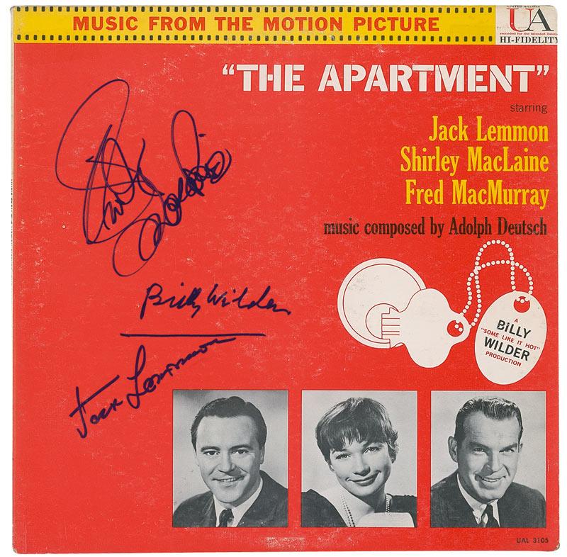 Music from The Apartment album signed on the front cover in blue felt tip by Jack Lemmon, Billy Wilder, and Shirley MacLaine. Some scattered light rubbing and surface wear to covers, as well as a few small pieces of tape affixed to covers, otherwise fine condition. The record is included.
