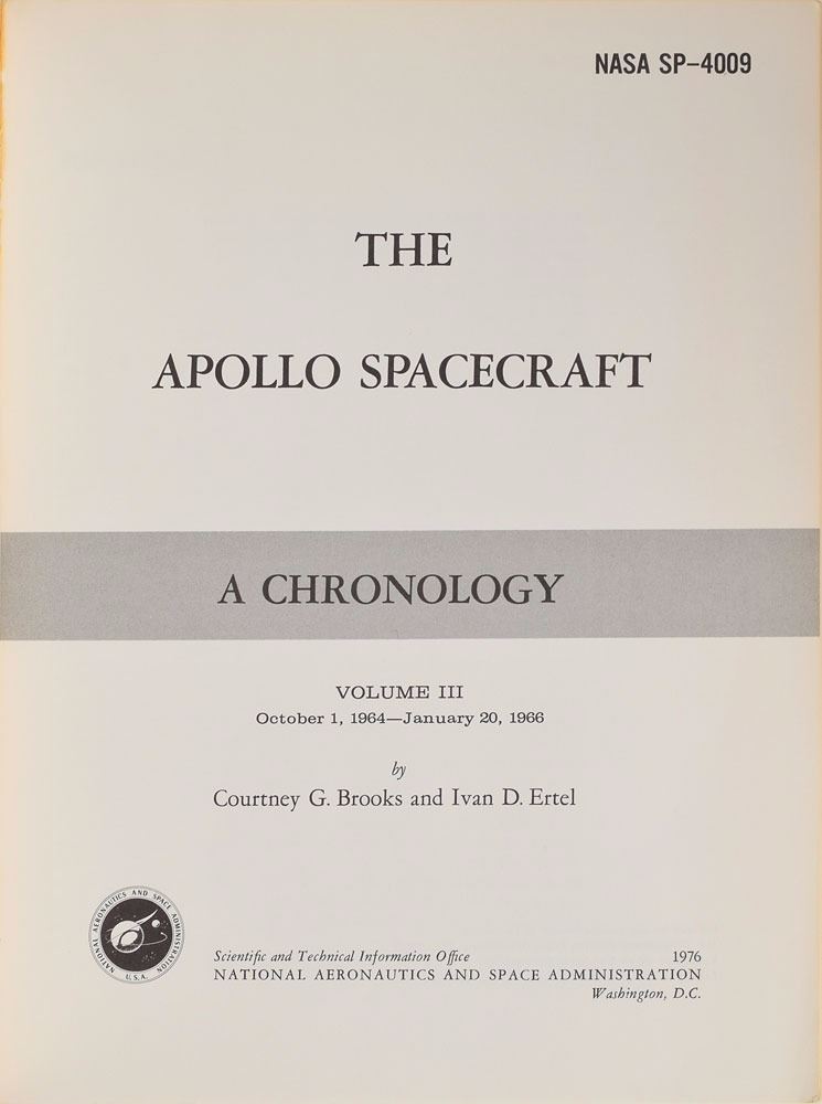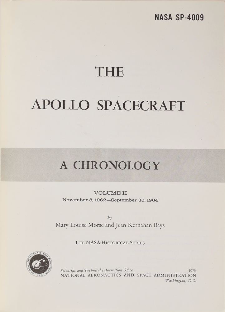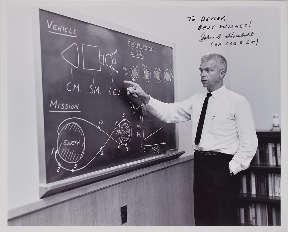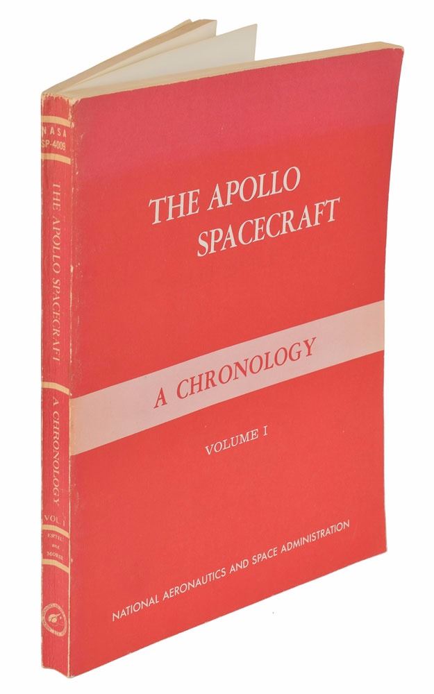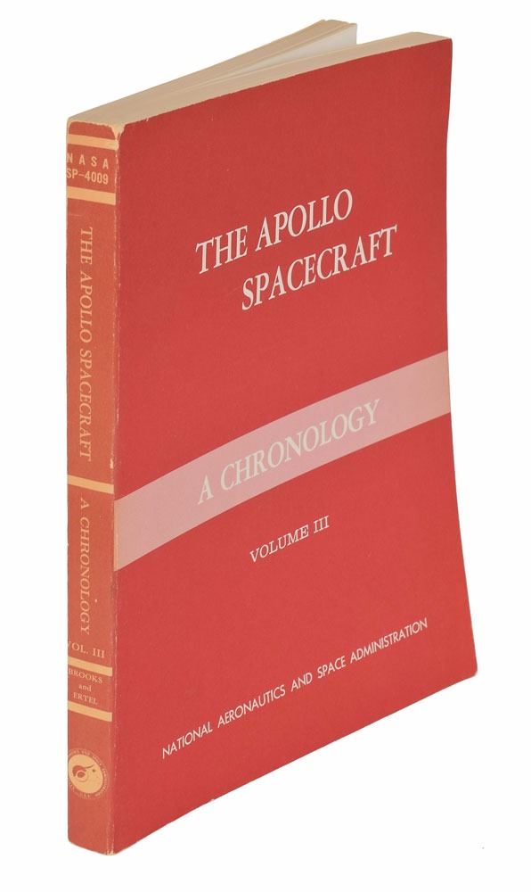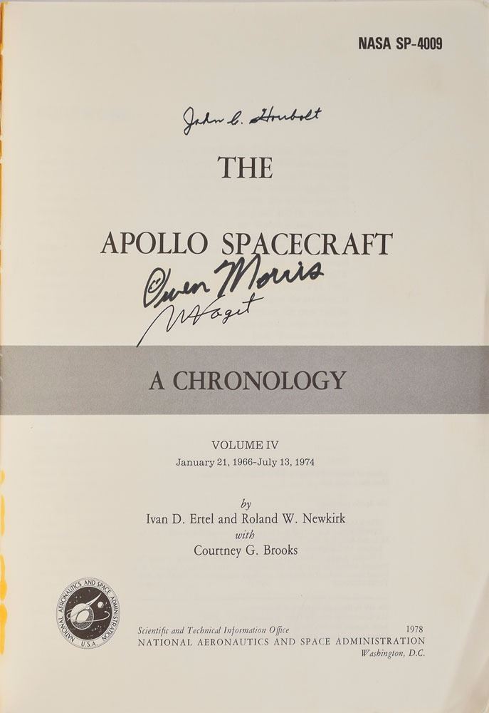 Complete set of The Apollo Spacecraft: A Chronology, Volumes 1–4. NASA SP–4009, Washington, DC: NASA, 1969–78. Softcovers, 7.75 x 10.25. The fourth volume is signed on the title page in black felt tip by three influential NASA figures: John Houbolt, Max Faget, and Owen Morris. In overall very good to fine condition, with wear and sunning to some spines, and very slight creasing to a couple covers. Accompanied by a glossy 10 x 8 photo of Houbolt explaining his Lunar Orbital Rendezvous plan at a chalkboard, signed and inscribed in black felt tip, "To Detlev, Best wishes! John C. Houbolt (of LOR & LM)." A fantastic and sought-after series relating to NASA's most storied program.