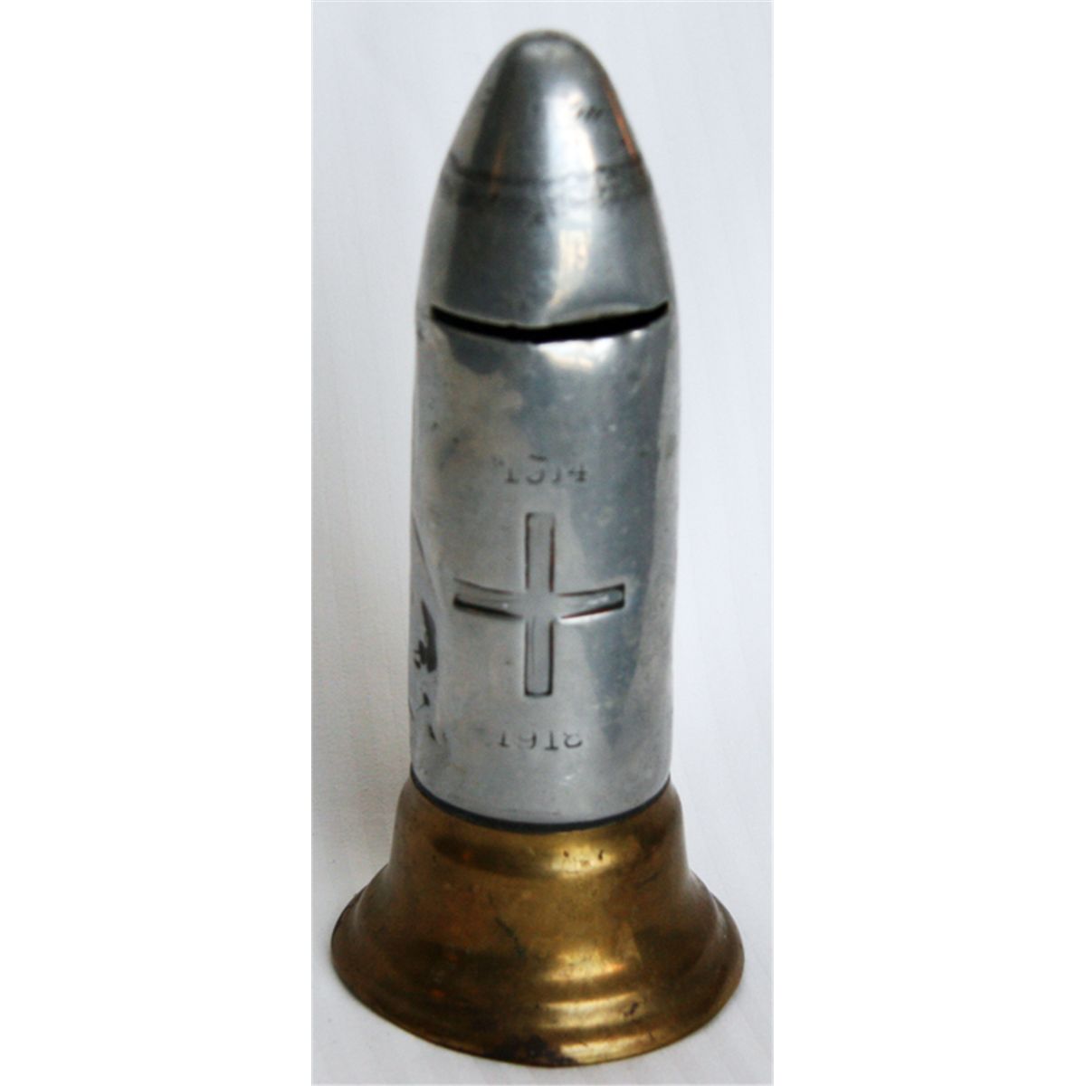 The Appearance of a Missile or large bullet shell, ‘1914’. Coin slot on top. No bottom. ‘Cross’ on side. 17cm x 4cm. Metal. VG.