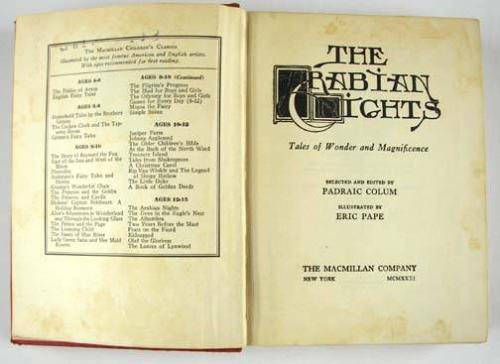 The Arabian Nights, Tales Of Wonder and Magnificence, selected and edited by Padraic Colum, illustrated by Eric Pape, published by The MacMillan Company, of New York, 1931, from the Estate of Charles Bunnell, Condition: Good, cover wear, no dust jacket
