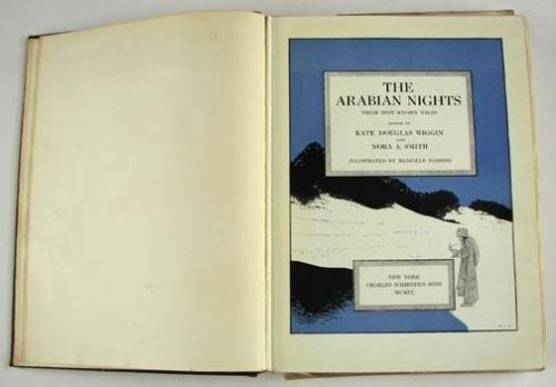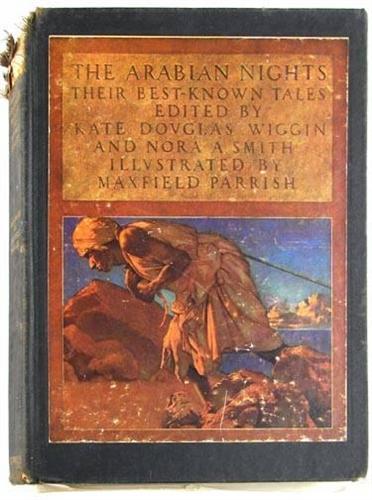 The Arabian Nights, Their Best Known Tales, Edited by Kate Douglas Wiggin & Nora Smith, Illustrated by Maxfield Parrish, published by Charles Scribner's Sons of New York, 1909, From the Estate of Charles Ragland Bunnell, Condition: Fair, 1" of spine missing, cover shows wear, writing inside including Charlie Bunnell's name -- written at age 11, no dust jacket