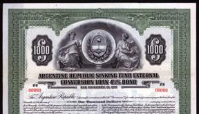 1936, $1,000. 4.5% sinking fund external conversion loan bond. Green border with two allegorical women flanking arms of Argentina vignette. ABNCo. Specimen with coupons, EF