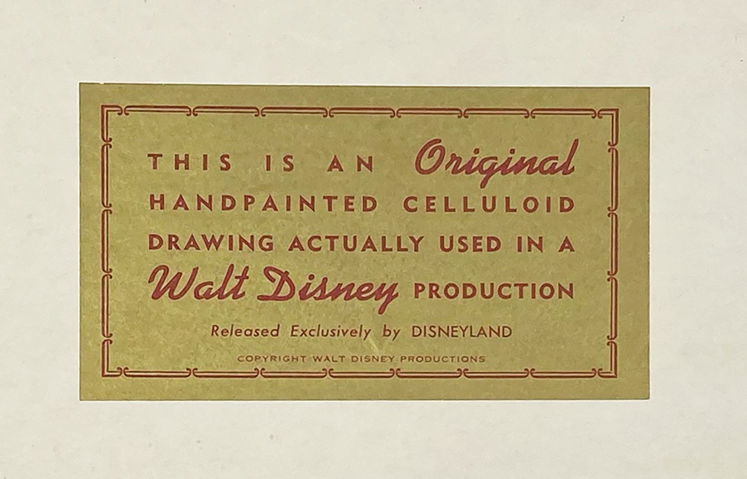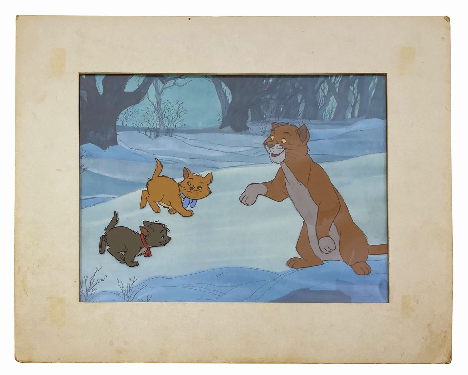 (Disney, 1970) An original production cel of Thomas O'Malley, Toulouse, and Berlioz from Walt Disney's The Aristocats. The cels are slightly trimmed to 10"x12" and placed on a color lithographic background, as prepared by the Walt Disney Studios for sale at Disneyland's Art Corner in Tomorrowland. The cel is still in its original Art Corner mat with gold label on the reverse. The piece still retains its original $3 price tag on the reverse from Walt Disney World, as the Art Corner cels were so popular that they were also sent to the Magic Kingdom for park guests to take home a piece of their favorite Disney productions. The entire matted piece measures 12"x14" with a mat opening of 7.75"x9.75". The cels are in fine condition with some light lifting in O'Malley's left leg.
