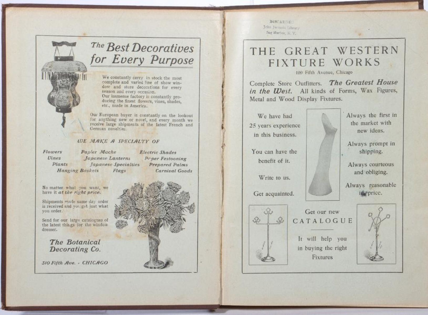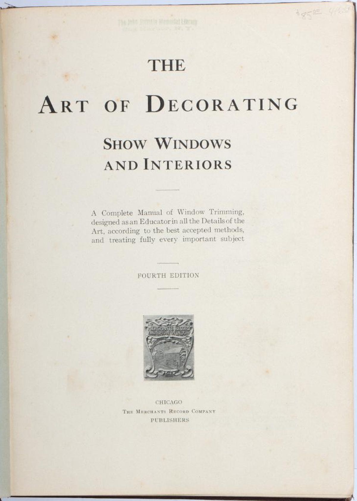 The Art of Decorating Show Windows and Interiors by L. Frank Baum. Merchants Record Company 1906-1909 stated 4 th edition. Original dark brown cloth stamped in white, blue endpapers. Bienvenue & Schmidt p. 25 Good to very good. Faded spine, cracked hinges. Small bookplate on rear endpaper.