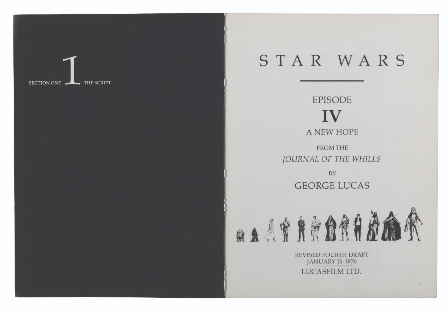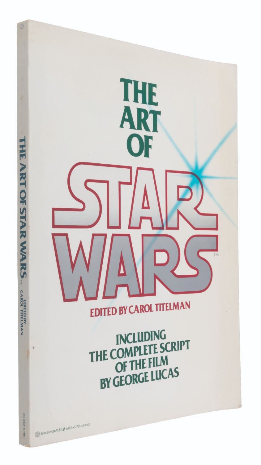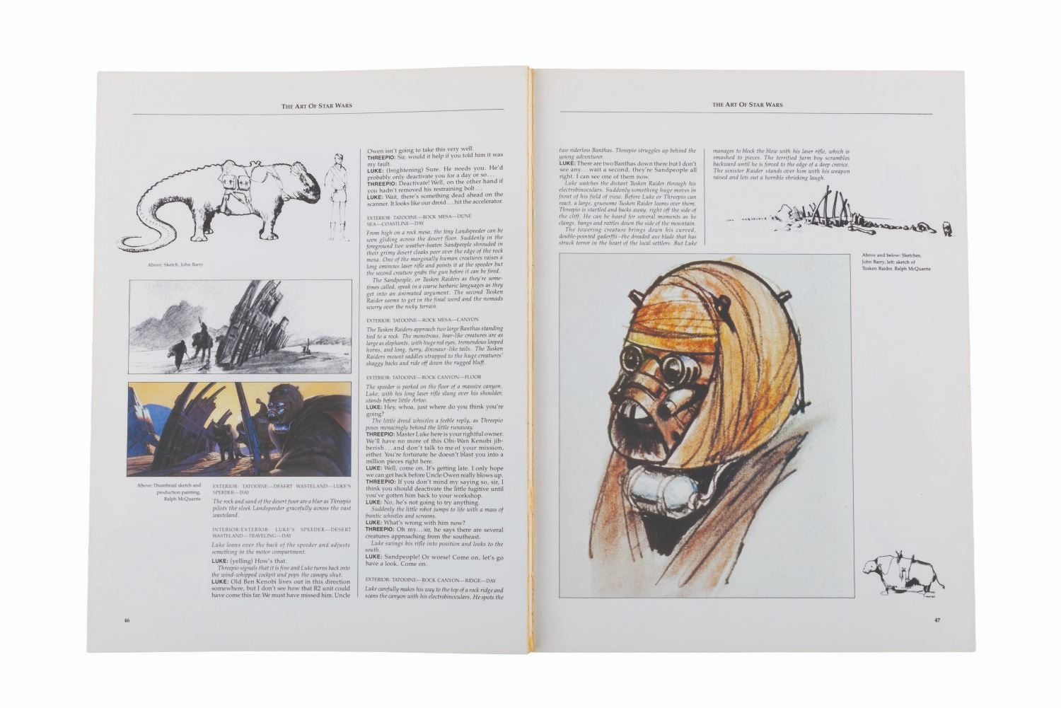 (Ballantine, 1979) The Art of Star Wars book featuring the full script for Episode Four, the first episode of the saga, and concept and production art for that groundbreaking film that came to be known as"A New Hope." Measuring 9" x 12", the 174 page soft cover book is in good condition, with typical wear from use including edge wear to the cover and a split to the binding.