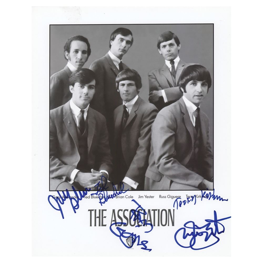 Glossy 8 x 10 Warner Bros. publicity photo of The Association, signed in blue felt tip by Terry Kirkman, Russ Giguere, Ted Bluechel, Jules Alexander, and Jim Yester. In fine condition.