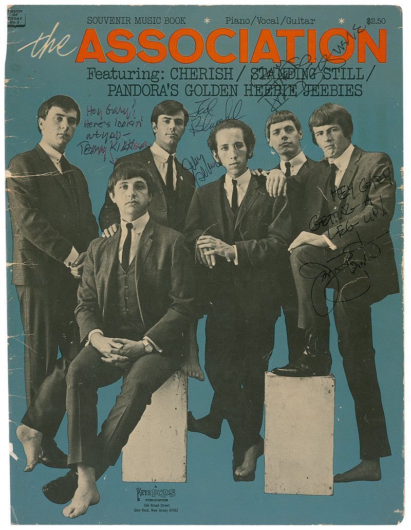 Association music book cover, 8.5 x 11, signed on the front in ballpoint by five of the original six members: Jules Alexander, Russ Giguere, Ted Bluechel, Terry Kirkman, and Jim Yester, with a couple inscribing to Gary. In very good condition, with some light contrast to a couple of signatures, scattered light creasing, mostly to edges, and some mild toning.