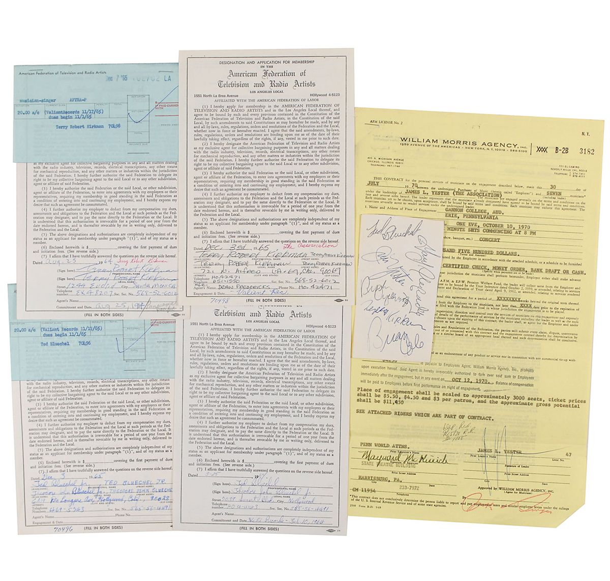 Collection of six items, each signed by one or more members of The Association, including: vintage circa 1966 ballpoint signatures of Gary Alexander, Jim Yester, Ted Bluechel, Terry Kirkman, Brian Cole, and Russ Giguere; two DSs signed twice by Terry Kirkman, both dated 1965; two DSs signed twice by Ted Bluechel, dated 1964 and 1965; a DS signed twice by Jim Yester, dated 1970. In overall fine condition. Accompanied by a 1970 performance contract, signed by an agent and a producer.
