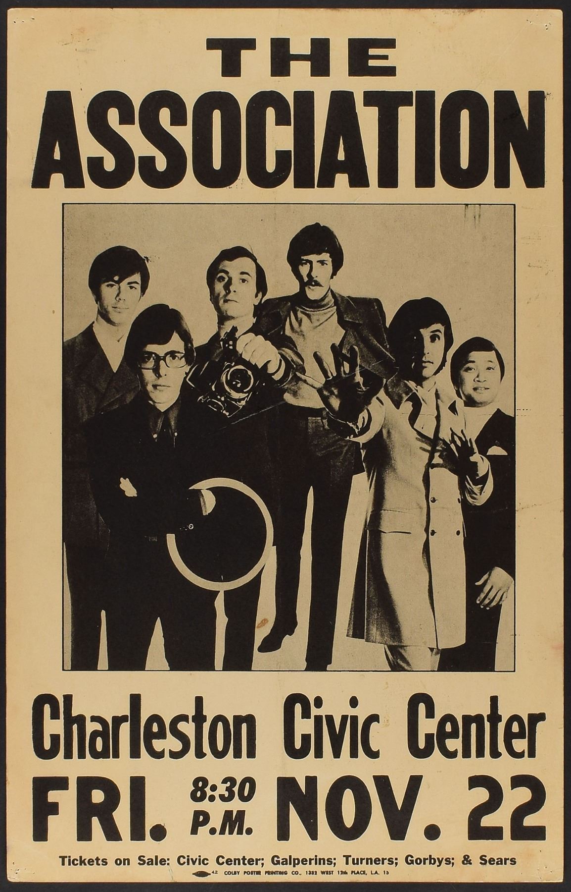 Original 14 x 22 window card poster for The Association at the Charleston Civic Center on November 22, 1968, featuring a large image of the group at the height of their popularity. Printed by the Colby Poster Printing Co. of Los Angeles. In very good to fine condition, with soiling, corner staple holes, and a central vertical bend.