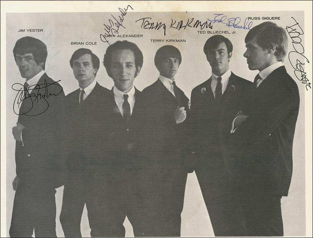 Vintage 11 x 8.5 songbook photo of the group, signed in ink and ballpoint by original members Russ Giguere, Terry Kirkman, Jim Yester, Ted Bluechel, and Jules Alexander. In fine condition, with some scattered light toning and soiling, mostly to top, and a trimmed bottom edge. RRAuction COA.