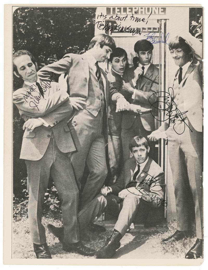 Original 8.5 x 11 paperstock songbook photo, signed in blue and black ink by Terry Kirkman, Ted Bluechel, Jim Yester, Jules Alexander, and Russ Giguere. In fine condition, with a rough edge from removal, a few corner tip creases, and a couple of staple holes to right edge.